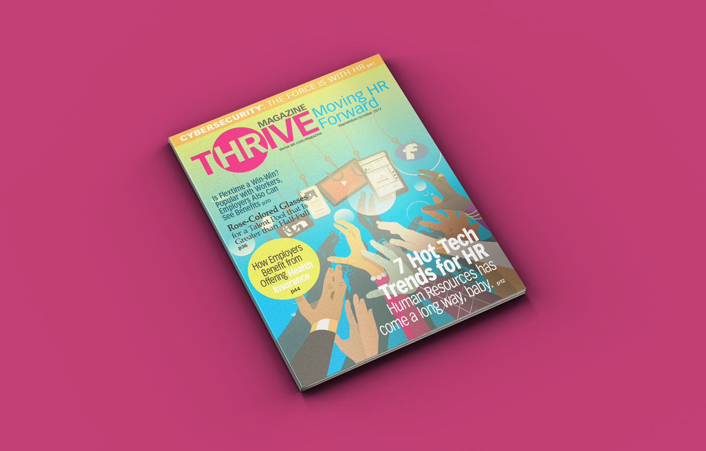 Cover design for the September/October 2017 issue of THRIVE HR Magazine. Cover story is entitled, "7 Hot Tech Trends for HR". Credits: Vincent Skyers | Kelly Church | Doug Ponte | James Davis