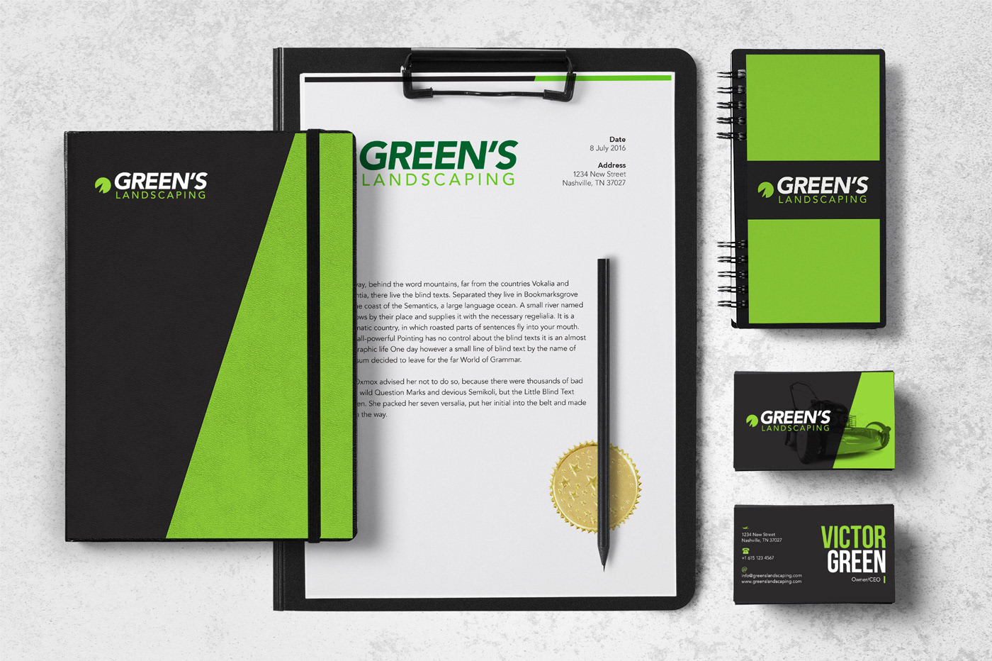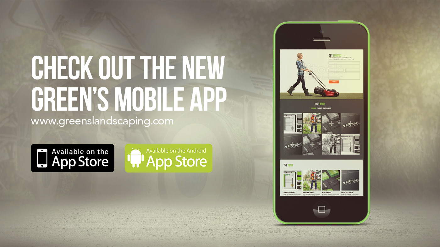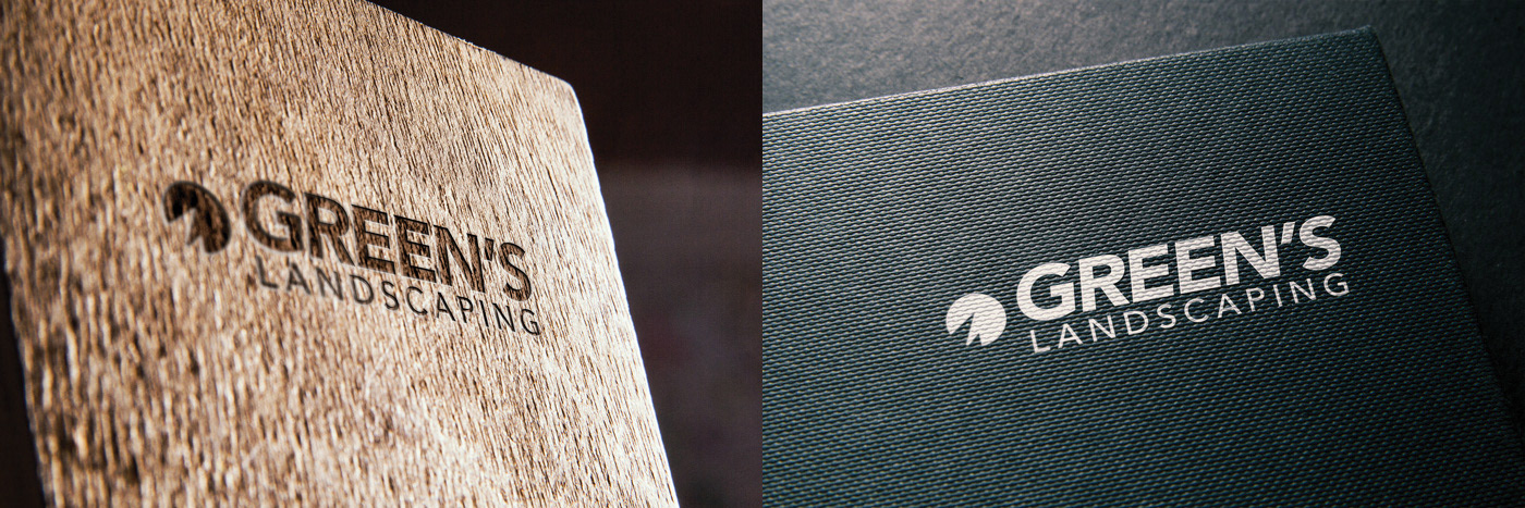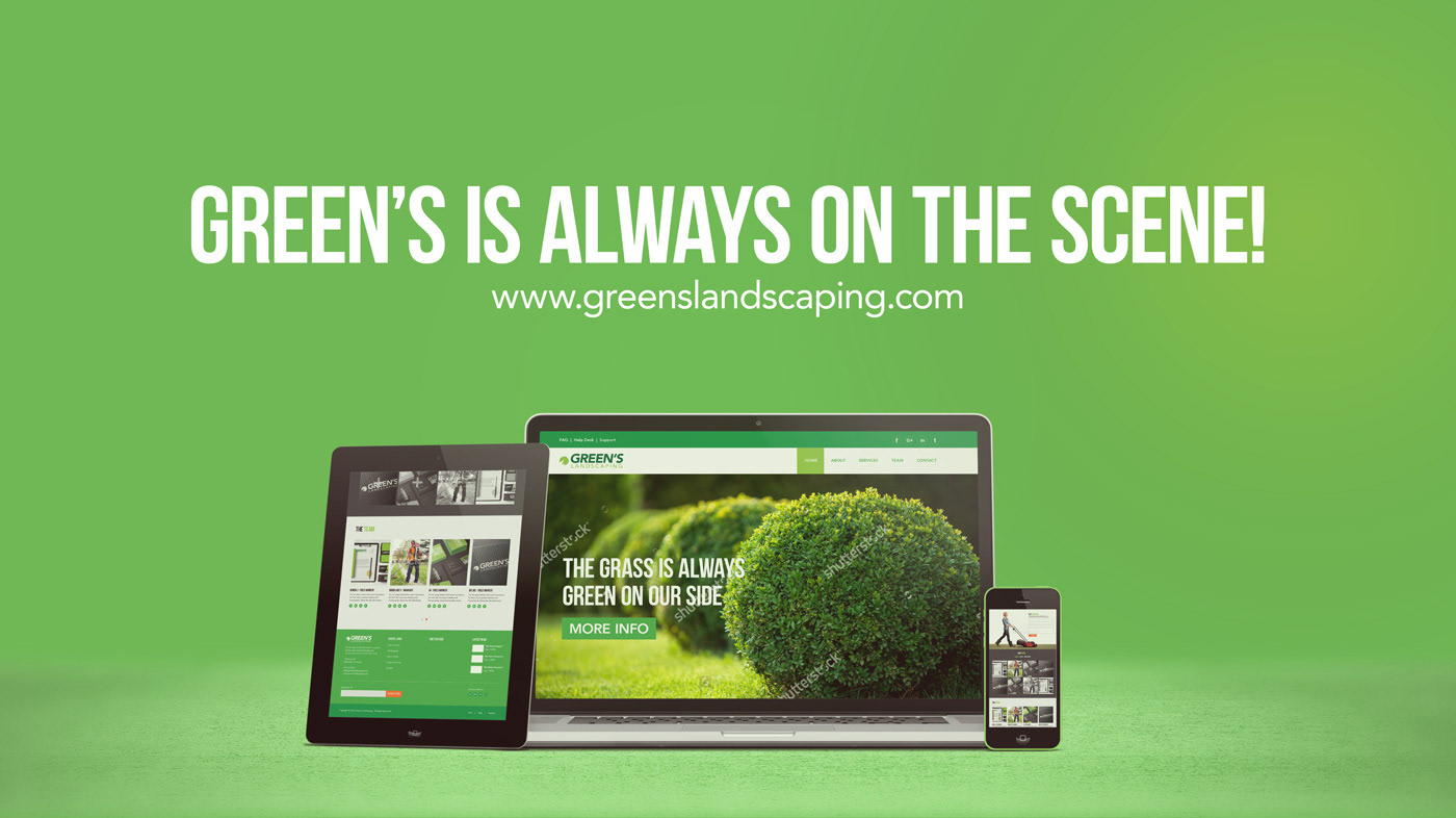 Logo design, stationery branding, media ads, and website concept for Green's Landscaping.