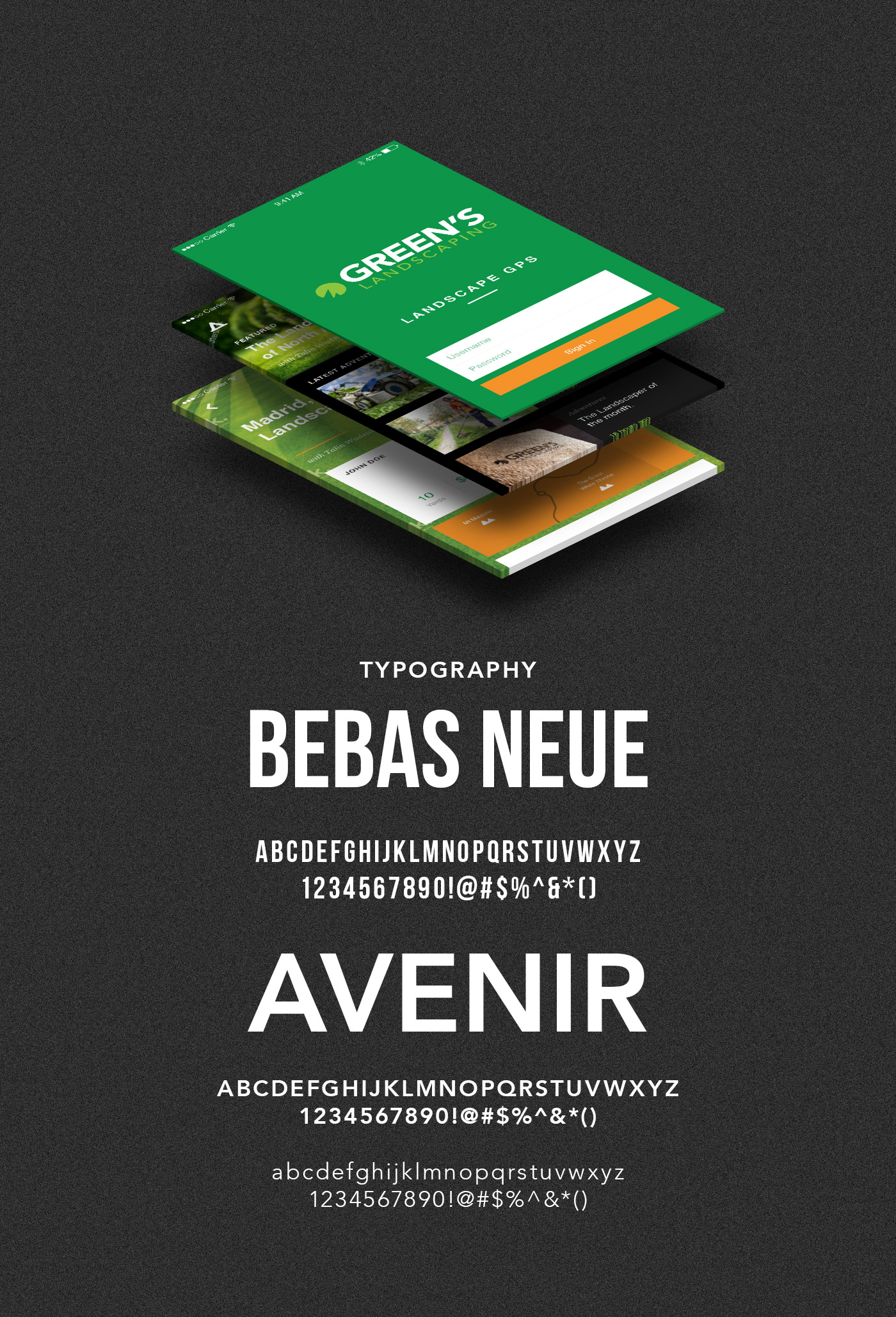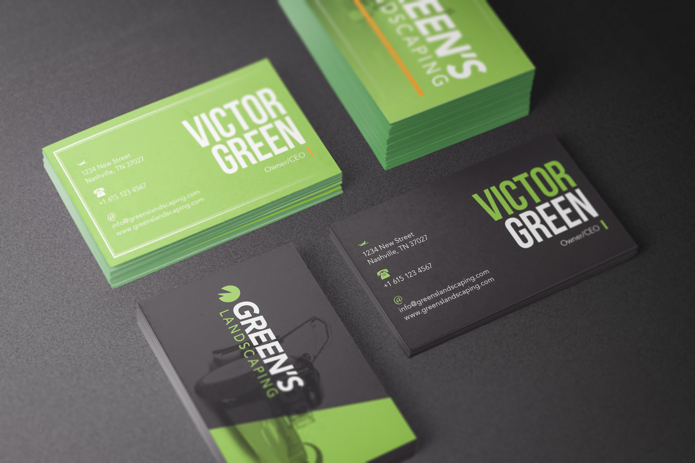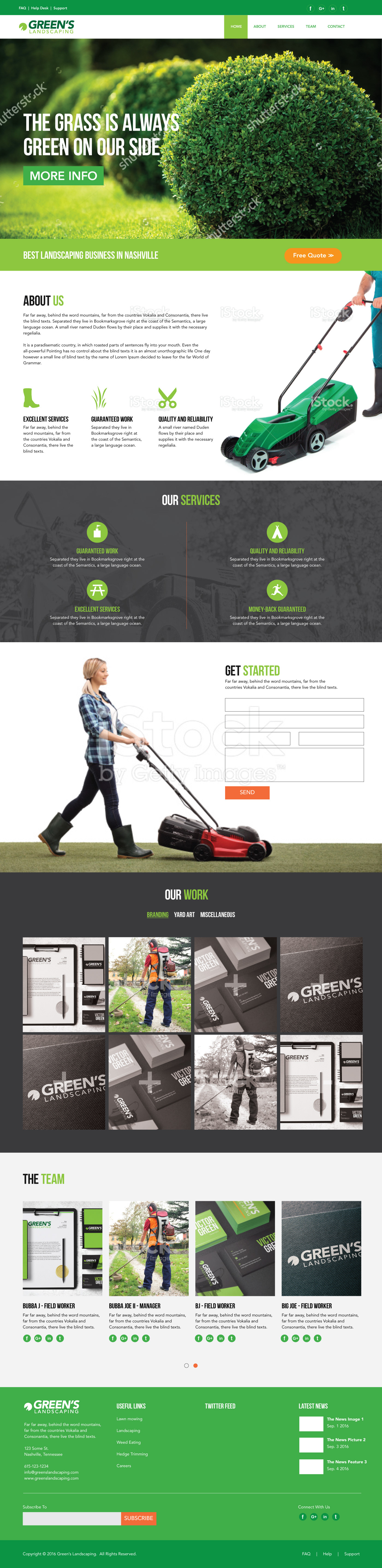 Logo design, stationery branding, media ads, and website concept for Green's Landscaping.