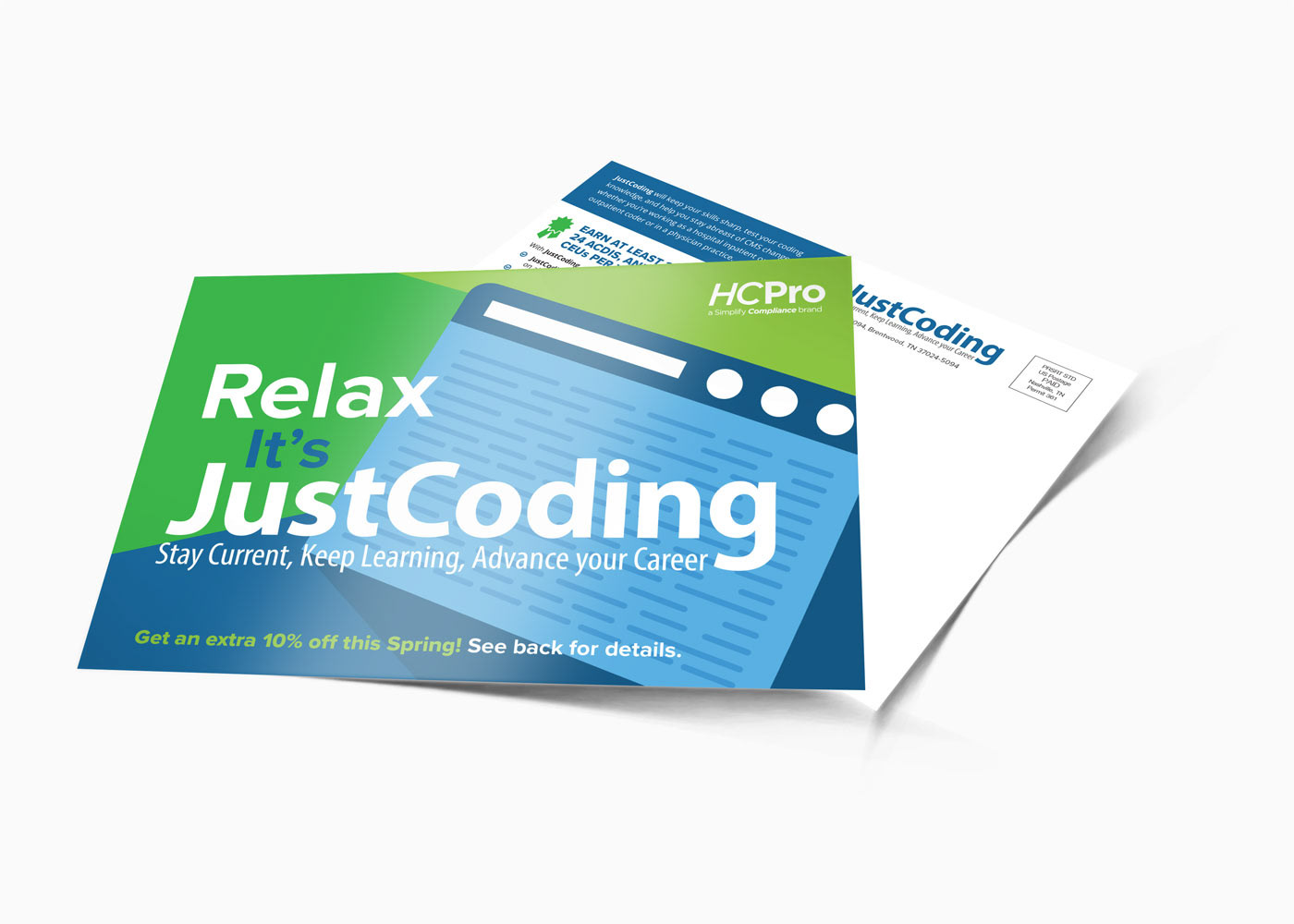 Direct mail postcard design for HCPro's JustCoding. The goal was to use coding related elements as the focal point while keeping the colors consistent with the overall brand.